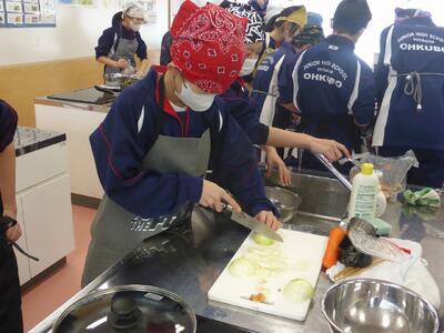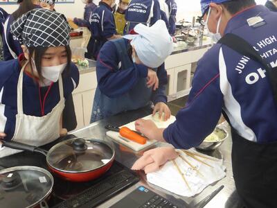 1年生が調理実習に挑戦 投稿: 承認者 (11:40) 1年生が家庭科の調理実習で「ちゃんちゃん焼き」に挑戦しました。玉ねぎやにんじんの千切りでは、慣れない包丁の扱いに緊張しながらも、一つひとつ丁寧に作業を進める姿が見られました。協力し合って調理した料理は、どの班もとてもおいしそうに仕上がりました。 0 -