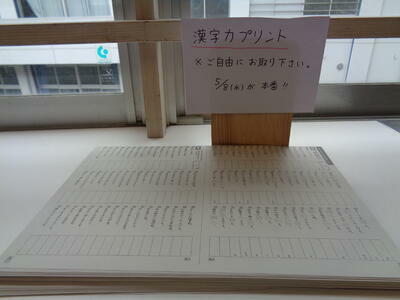 5/8(水)に第1回漢字力テストが実施されます。2年生のロッカーの上には、練習用のプリントが置かれていました。スマホやタブレットの普及で、文字を書く機会が少なくなっています。漢字練習は繰り返し書いて身につけるための大切な学習です。50問程度の範囲から25題を出題しますので、しっかり練習に励みましょう。