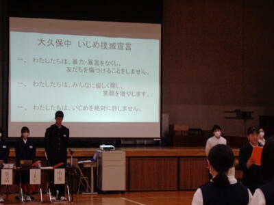 また、「大久保中いじめ撲滅宣言」や「「大久保中 携帯・スマホ・SNS 5箇条」についても全校生徒で再確認しました。