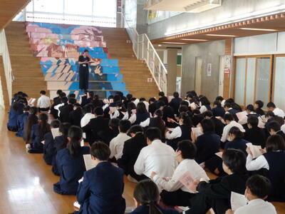 生徒会長から今年度のスローガンが発表されました。スローガンは「THE SKY IS THE LIMIT ~未来へのステップ~」で、「可能性は無限大だ」という意味です。「私たち(生徒たち)が抱く可能性を最大限に広げ、新しい未来を切り開いていきたい」という思いが込められています。